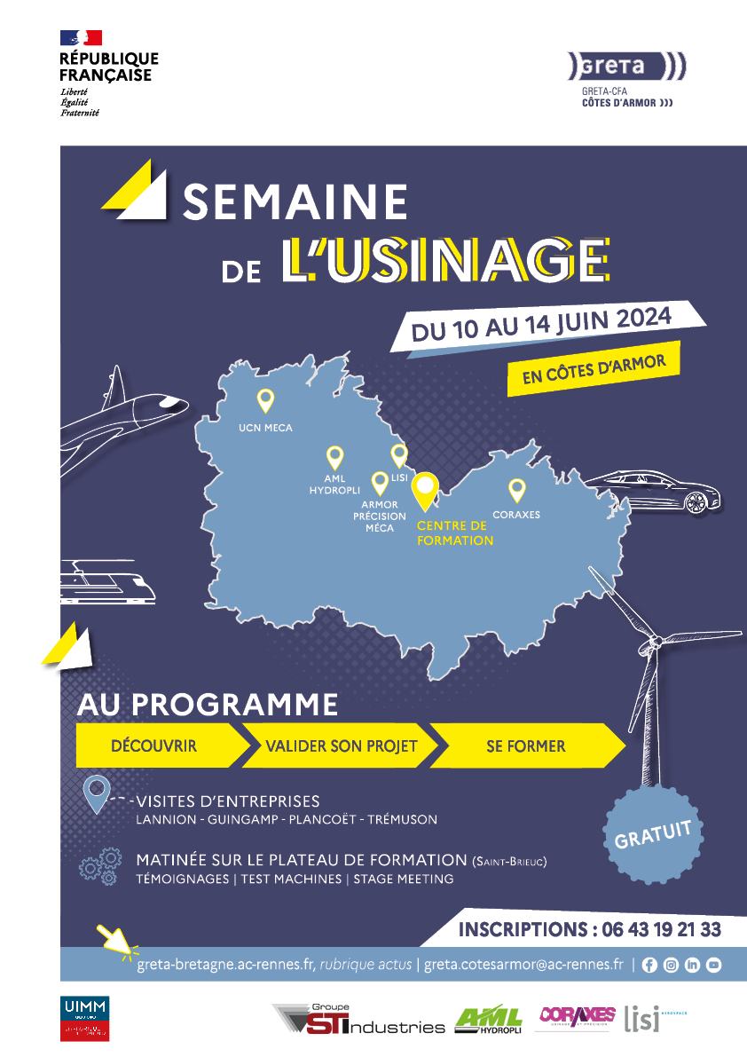 Venez découvrir les métiers de l'usinage lors de la semaine de l'usinage du 10 au 14 juin 2024, événement créé en partenariat avec l'UIMM Bretagne. Rejoignez-nous pour des visites d'entreprises à travers tout le département : Lannion, Guingamp, Plancoët, Trémuson. Vous aurez l'opportunité de découvrir les métiers de l'usinage et d'échanger directement avec des professionnels du secteur. Aucun engagement de formation n'est nécessaire.
