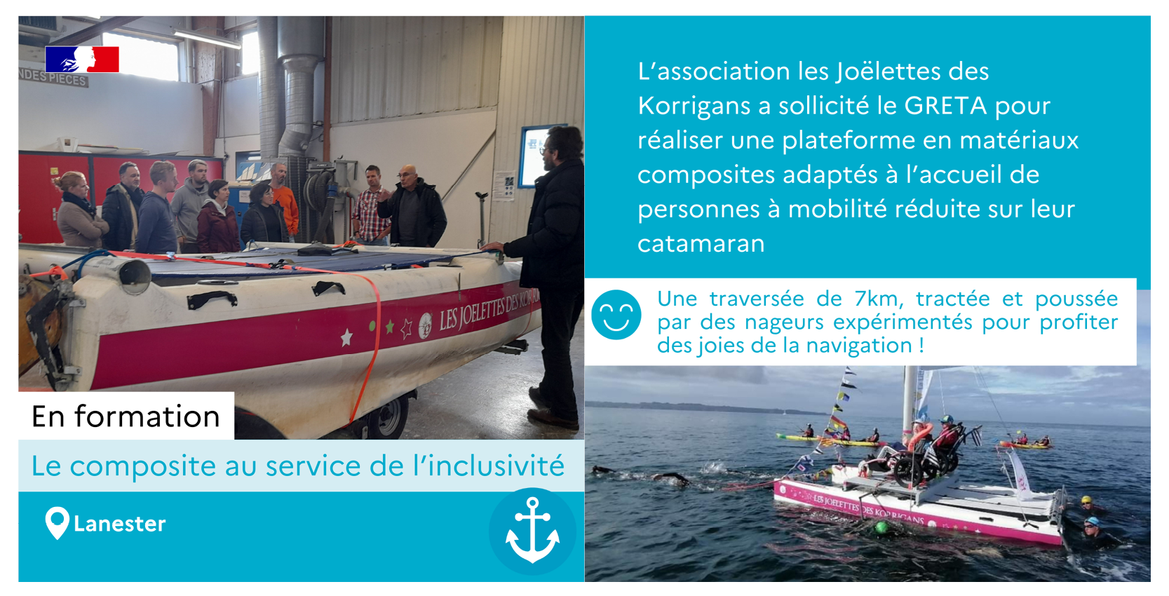 Pour améliorer la sécurité des passagers du catamaran, l'association s'est tournée vers le GRETA-CFA Bretagne Sud, reconnu pour sa formation en matériaux composites, idéaux pour les activités en mer. Cette formation prépare des professionnels destinés à rejoindre les équipes de construction navale de la "Sailing Valley".