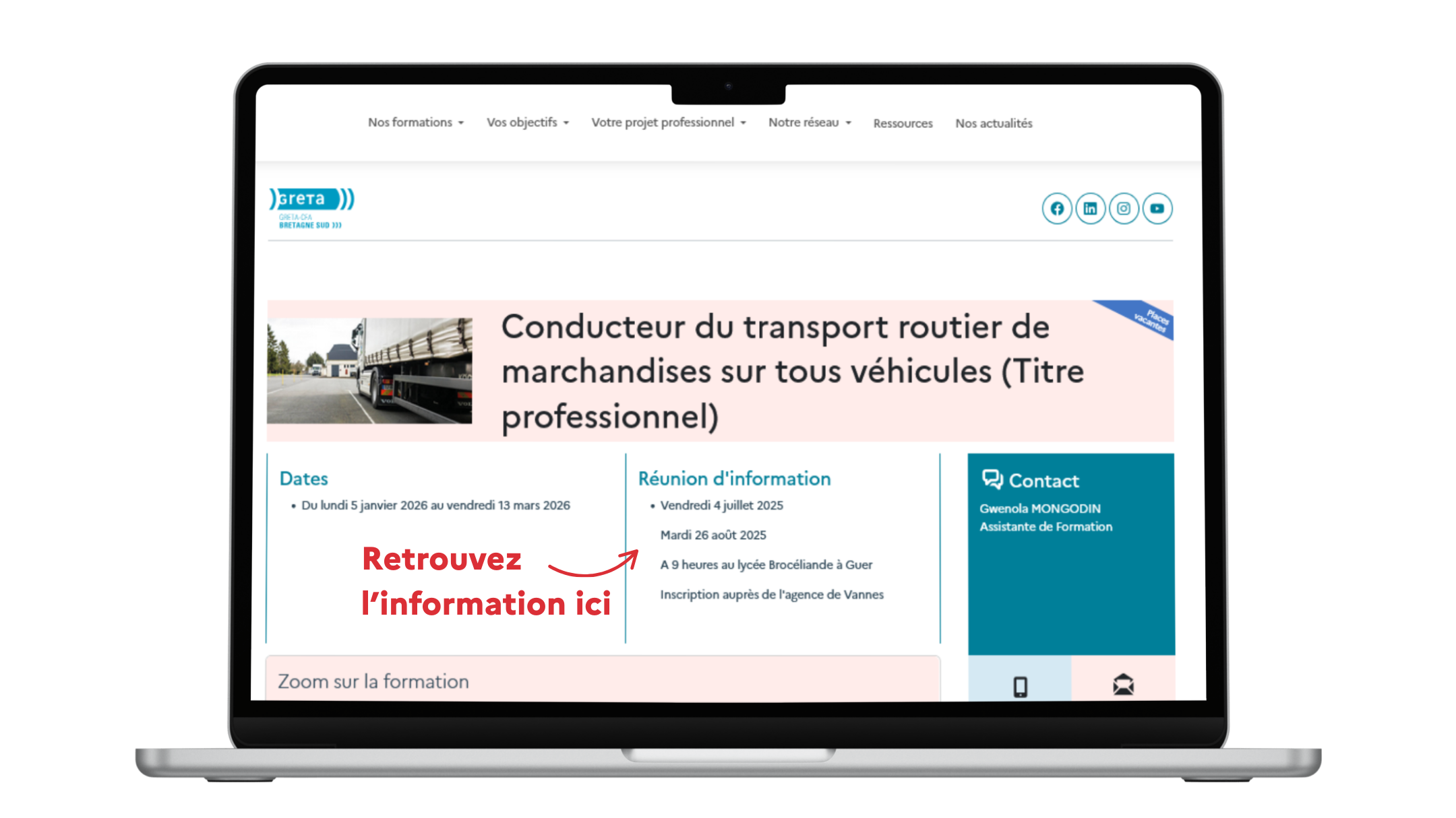 Depuis la page dédiée à la présentation de la formation, vous trouverez la liste des réunions d’information-conseil (comme illustré ci-dessous !) programmées pour vous présenter les objectifs pédagogiques et le déroulé complet de nos formations financées par la Région Bretagne.