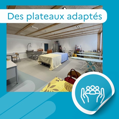 Nous nous sommes inspirées de la salle flexible de formation afin d’aménager les nouveaux locaux au Lycée Mona Ozouf de Ploërmel. Dans une seule salle de formation, il y a différents plateaux techniques selon les CCP abordés lors de la formation TP ADVF et TP ASMS. Cette salle est à côté de la salle de formation donc les stagiaires alterneront entre la pratique et la théorie.Nous essayons aussi de mettre en place des activités directement sur des lieux professionnels.