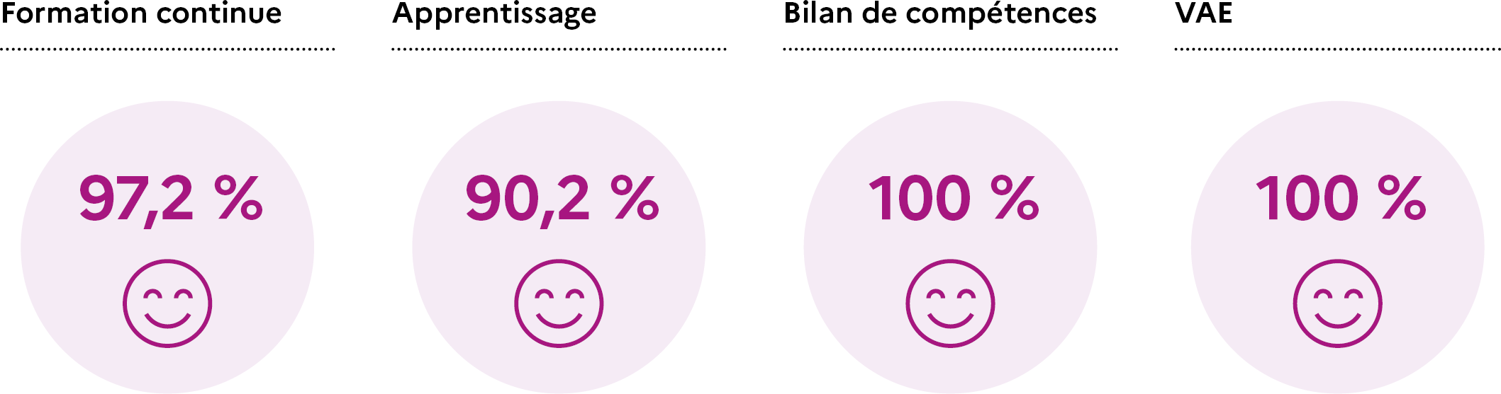 Ce taux est global et porte sur l’ensemble des éléments qui concourent au bon déroulement de la formation pour le stagiaire : l’accueil, les locaux et ressources, les contenus de formation, les conditions de formation, l’alternance, l’accompagnement... Il est établi à partir questionnaires de satisfaction de fin de formation.