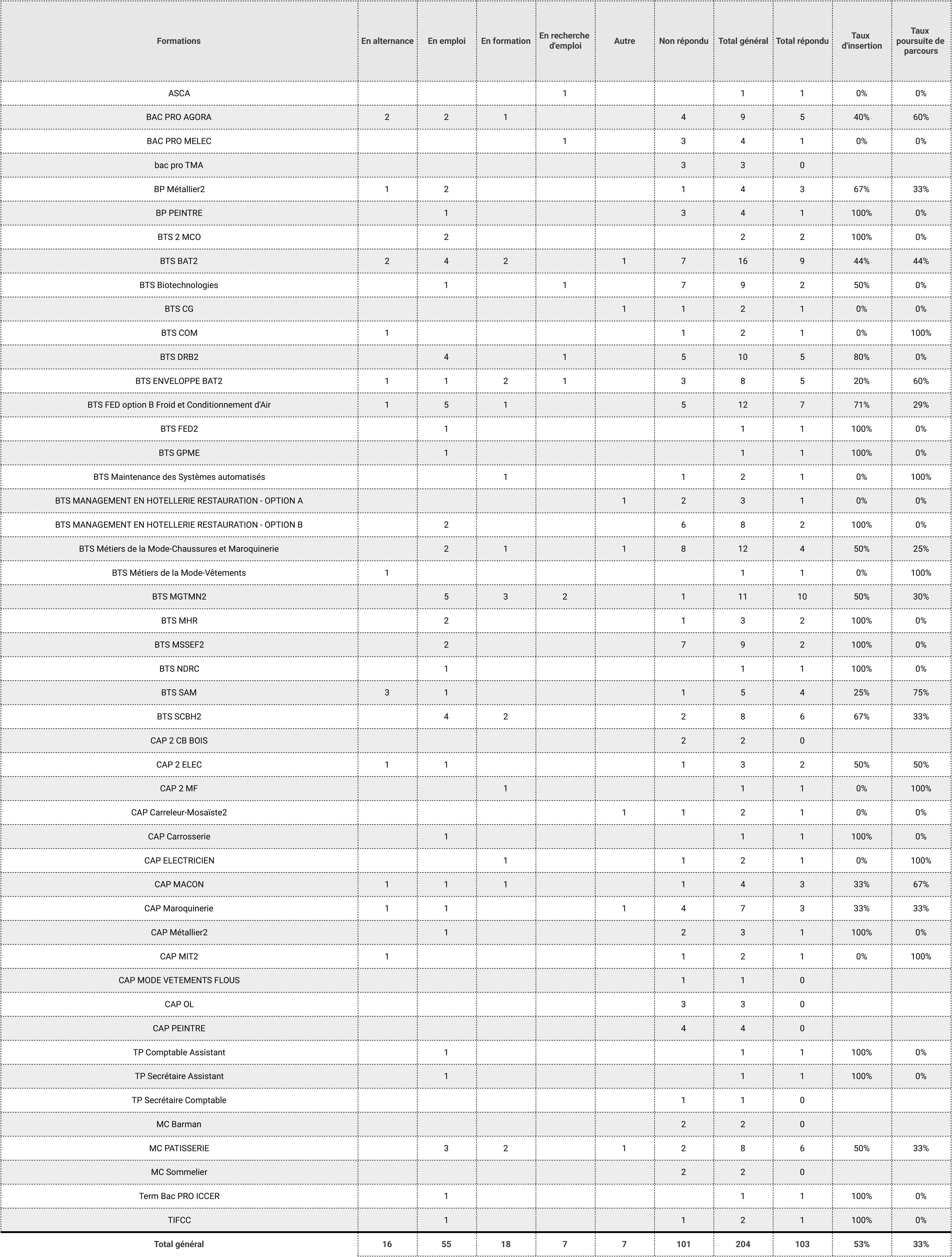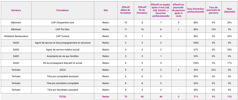 - Taux d'insertion professionnelle des sortants de l'établissement concerné, à la suite des formations dispensées : 52%
