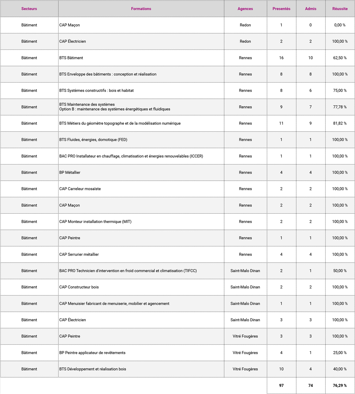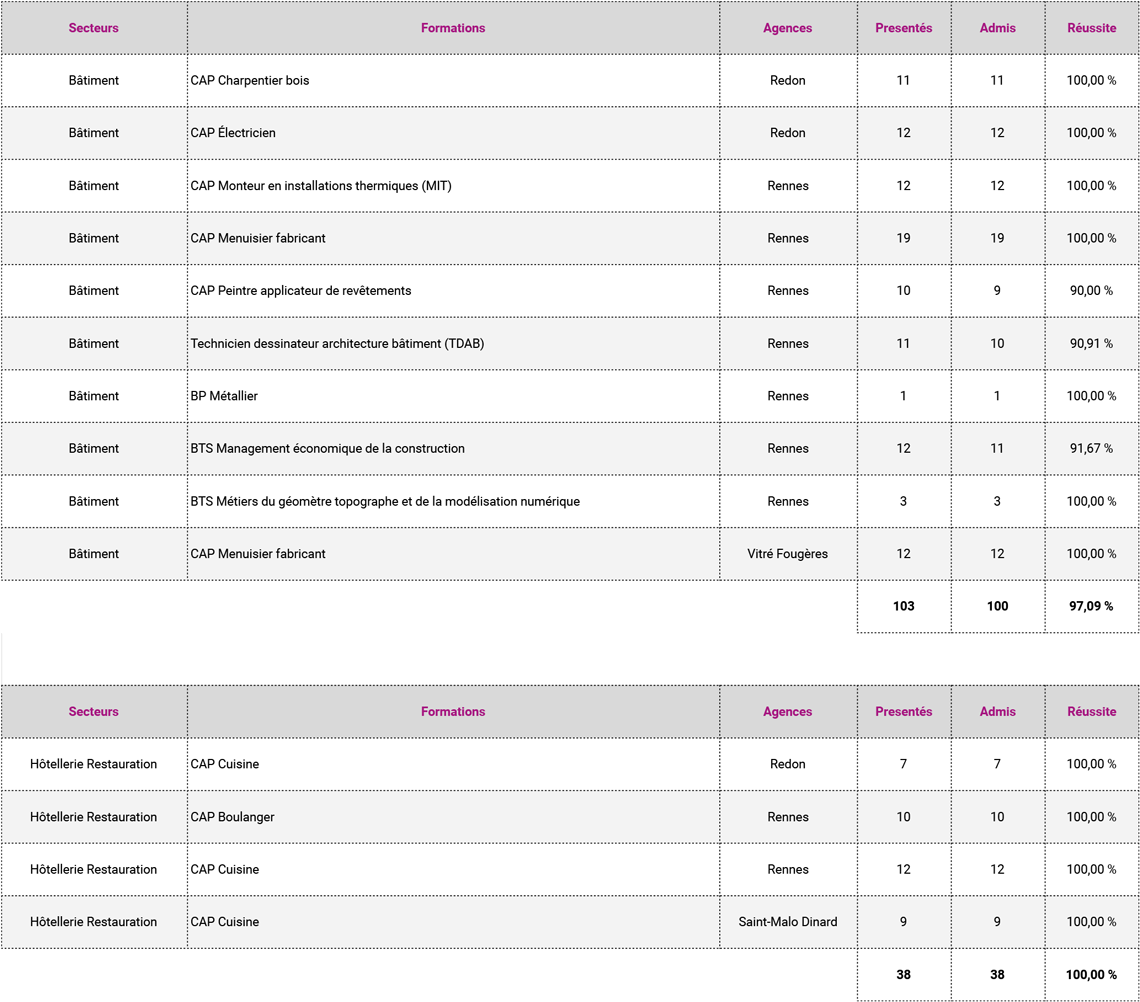 - Taux d'obtention des diplômes ou titres professionnels : 83%