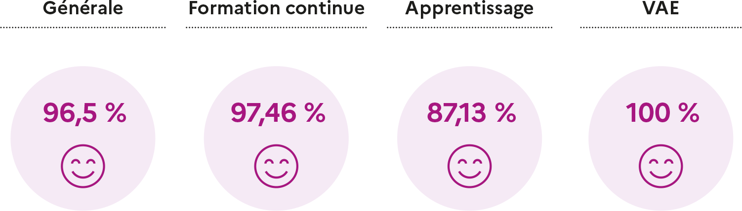 Ce taux est global et porte sur l’ensemble des éléments qui concourent au bon déroulement de la formation pour le stagiaire : l’accueil, les locaux et ressources, les contenus de formation, les conditions de formation, l’alternance, l’accompagnement... Il est établi à partir questionnaires de satisfaction de fin de formation.